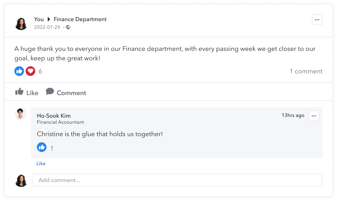 Share wins and appreciation across your organization, no matter where your people work. Engage in others’ posts and join in the celebration. Customize how feedback is shared so you can send feedback individually or publicly.